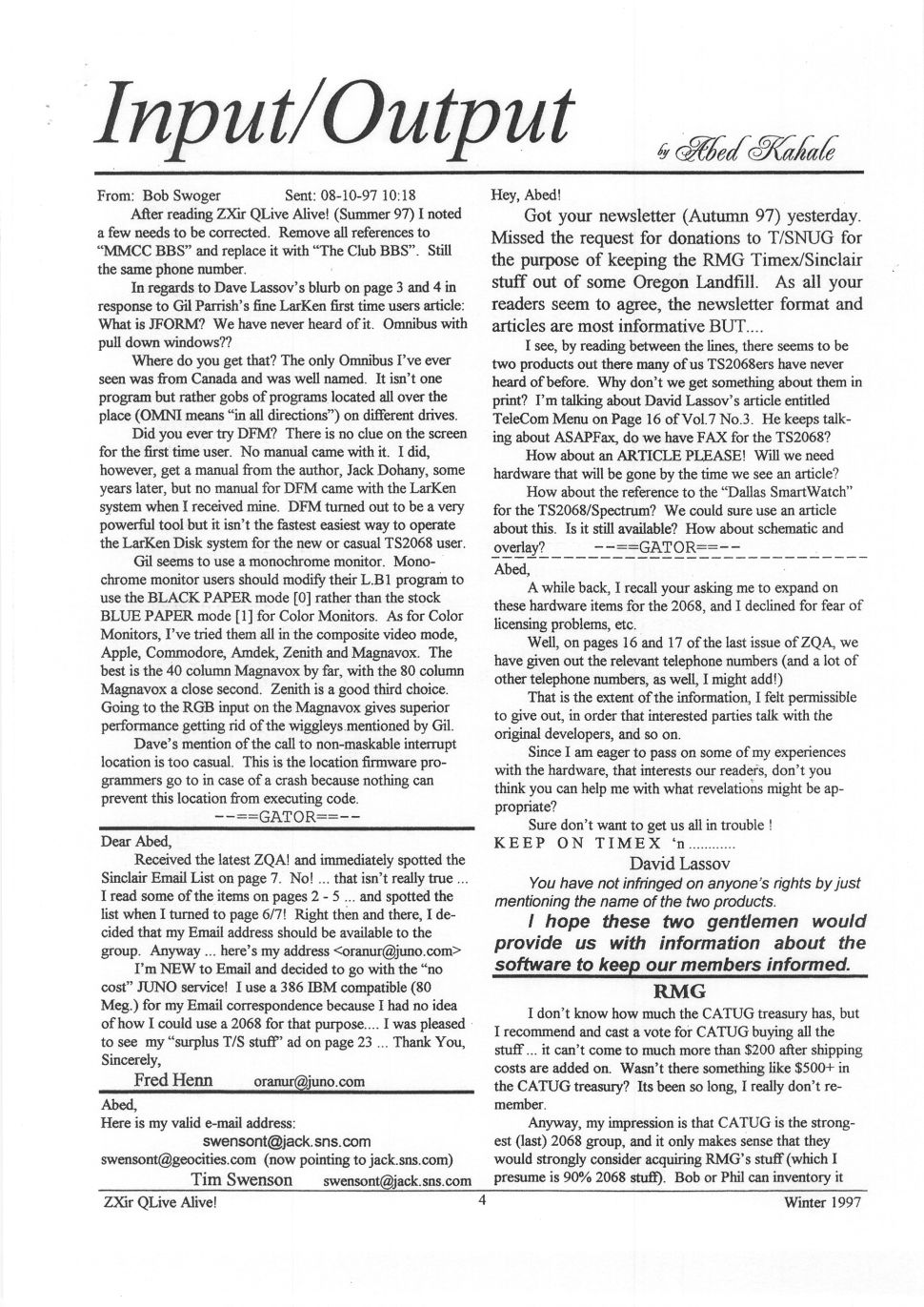 Magazine : ZXir QLive Alive (English) Issue : 4 Page : 4 Date: April 1998 Volume: 7 Medium : Paper Updated On : 2020-06-04 05:33:31 Hi-res : No 12345...2930