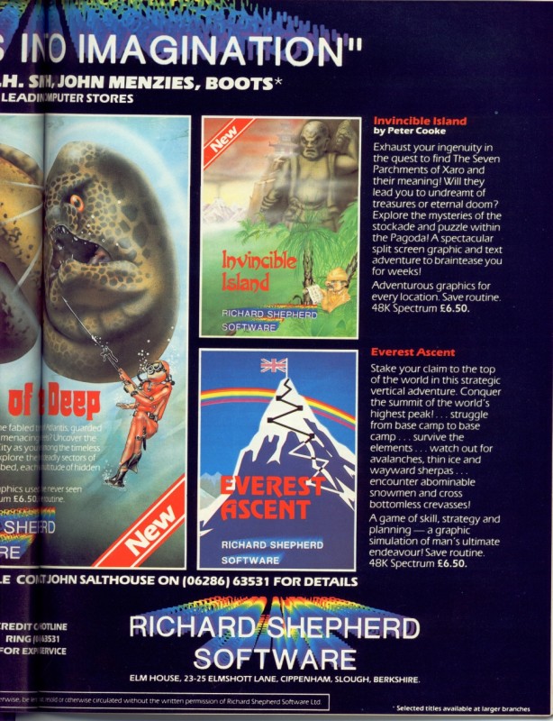 - Two-page ad -Richard Shepherd Software - Devils of the Deep + Transylvanian Tower + Super Spy + Invincible Island + Everest Ascent 80