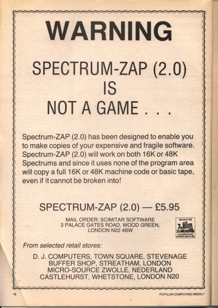| Spectrum ZAP 2 | Scimitar Software | Utility: Copy/Backup | 1983 |