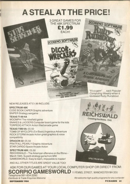 | Ruby Runabout | Scorpio Software | Adventure: Text | 1984 |