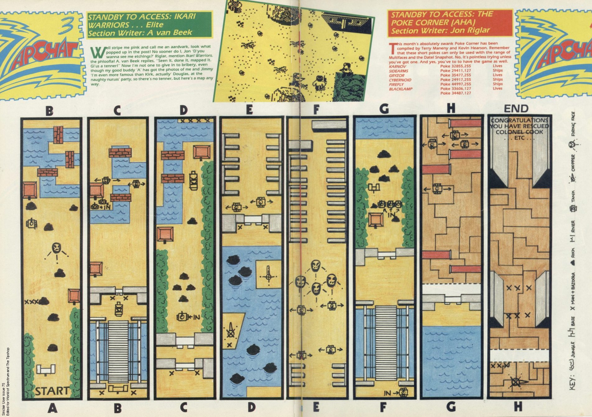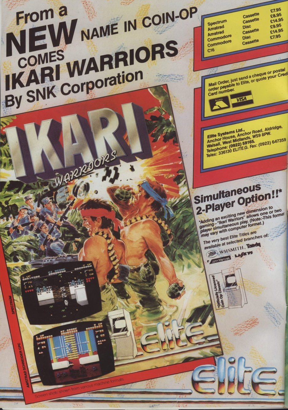 Comments: Ikari Warriors was originally announced for release end of 1986, written by {publishers|3090}. The various magazines were allowed to preview the game. However, for an as yet unknown reason, all went silent until it was finally released in 1988, written by {publishers|3118} instead.#This earlier version was reportedly finished, so we might find a copy sometime...